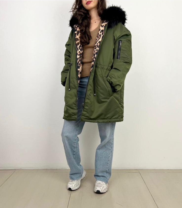 Abrigo reversible, un lado verde y el otro animal print, a parte de su pelo negro en capucha.