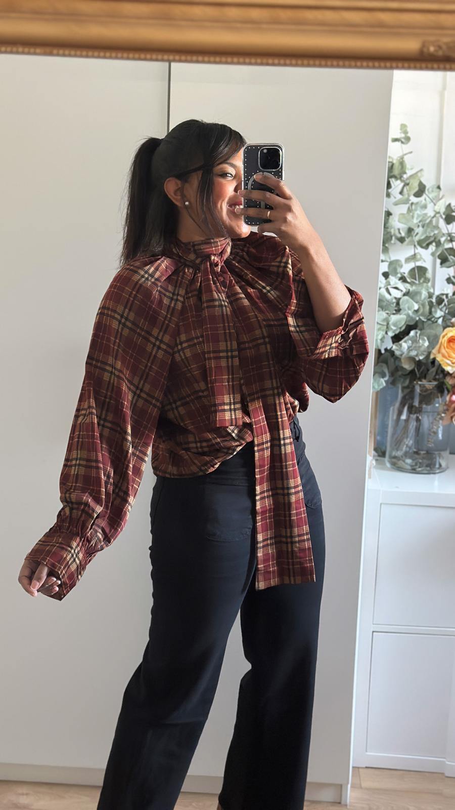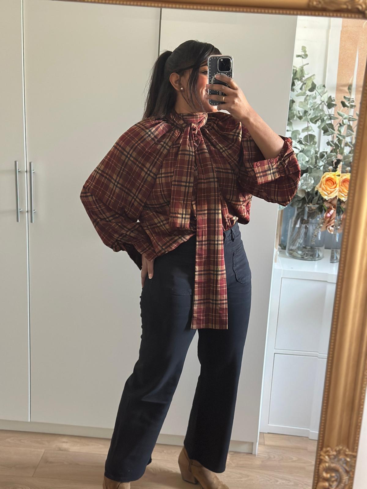 Blusa de cuadros marrón con cuello que se ata con lazada. Tejido vaporoso muy estiloso.