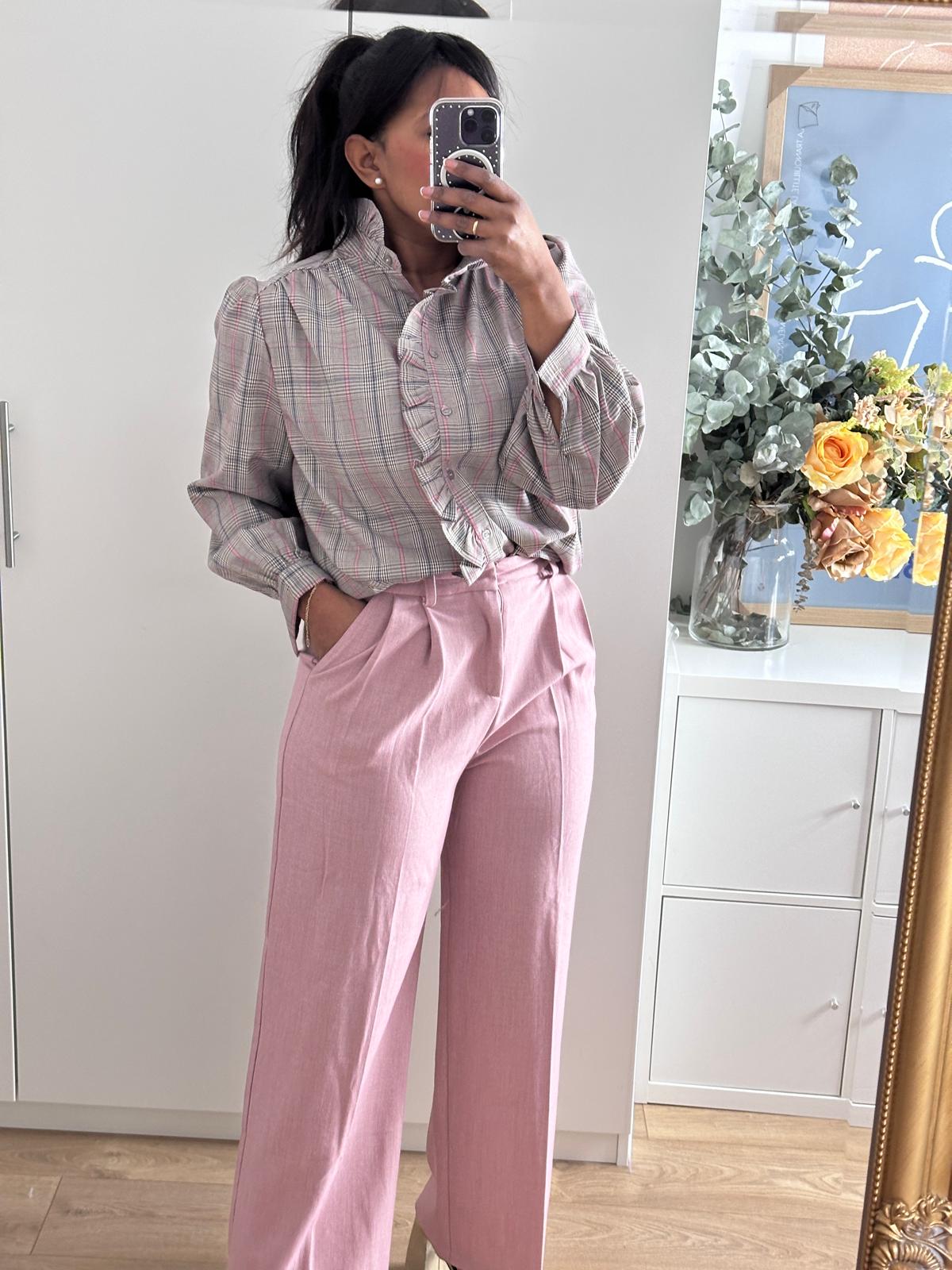 Blusa de rayas grises con rosa con cuello diferente, 100% algodón.