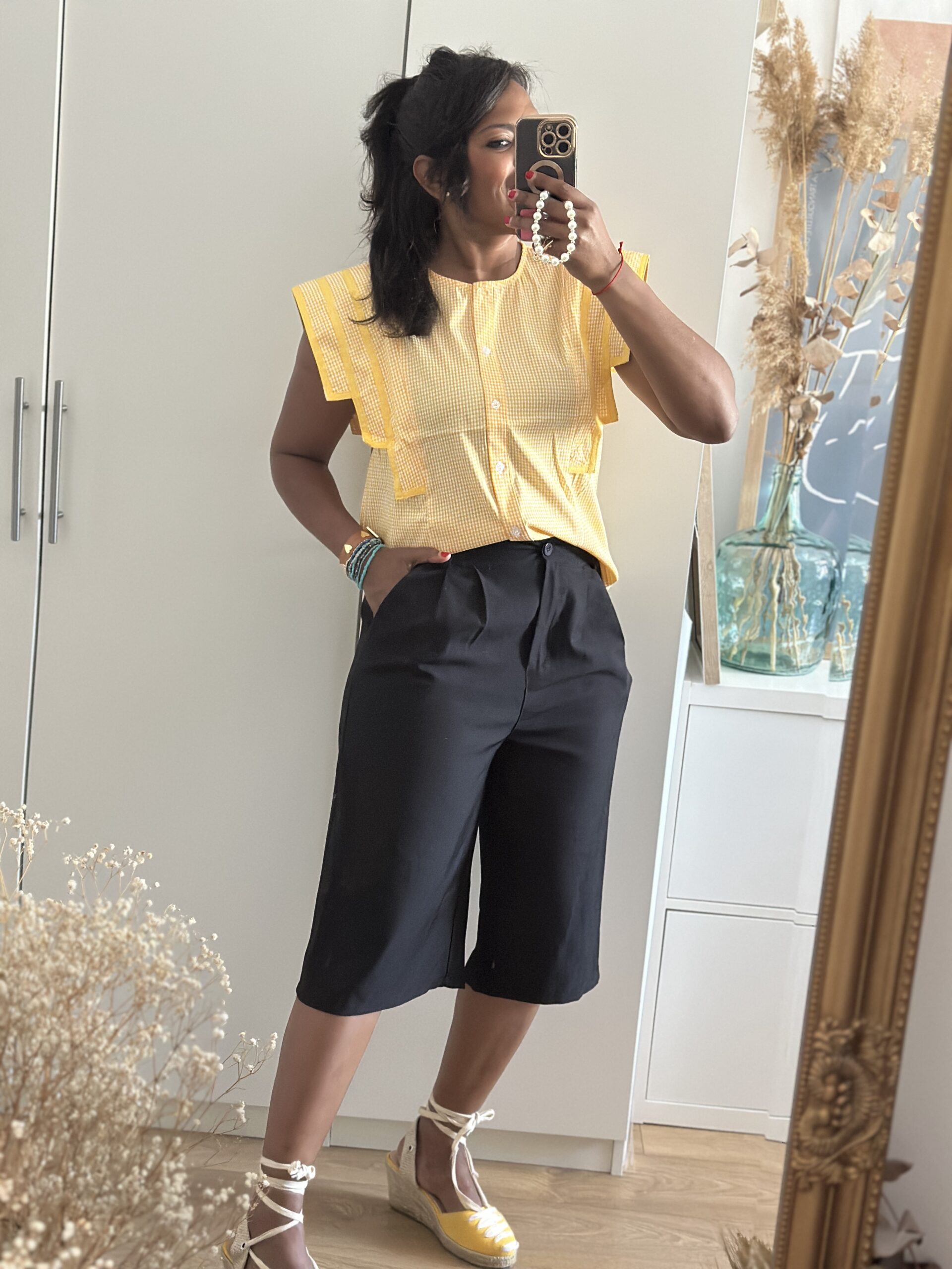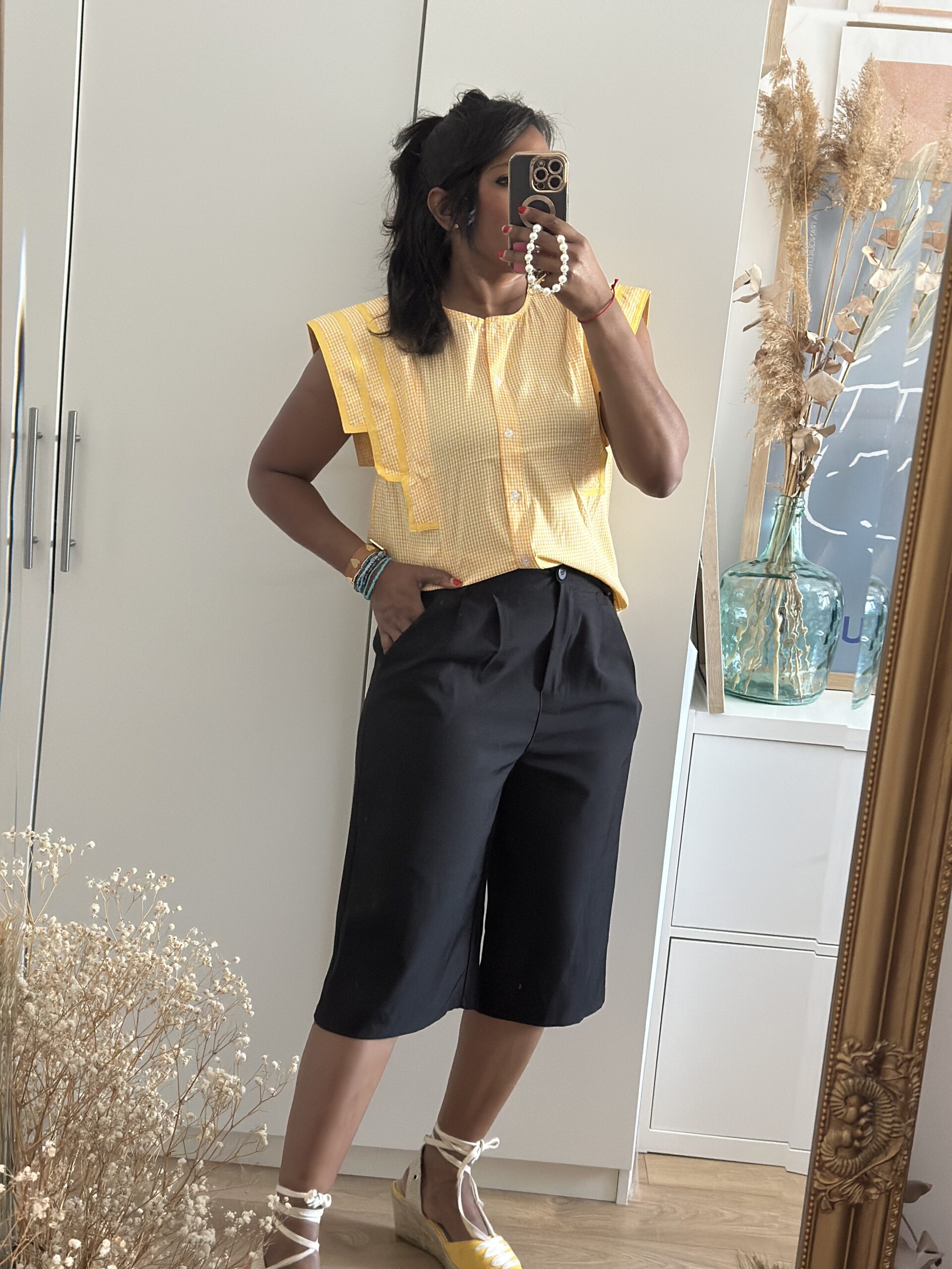 Blusa de estampado vichy con cenafeas amarillas en los bordes de la solapa. Tallaje normal , llevo la talla M .