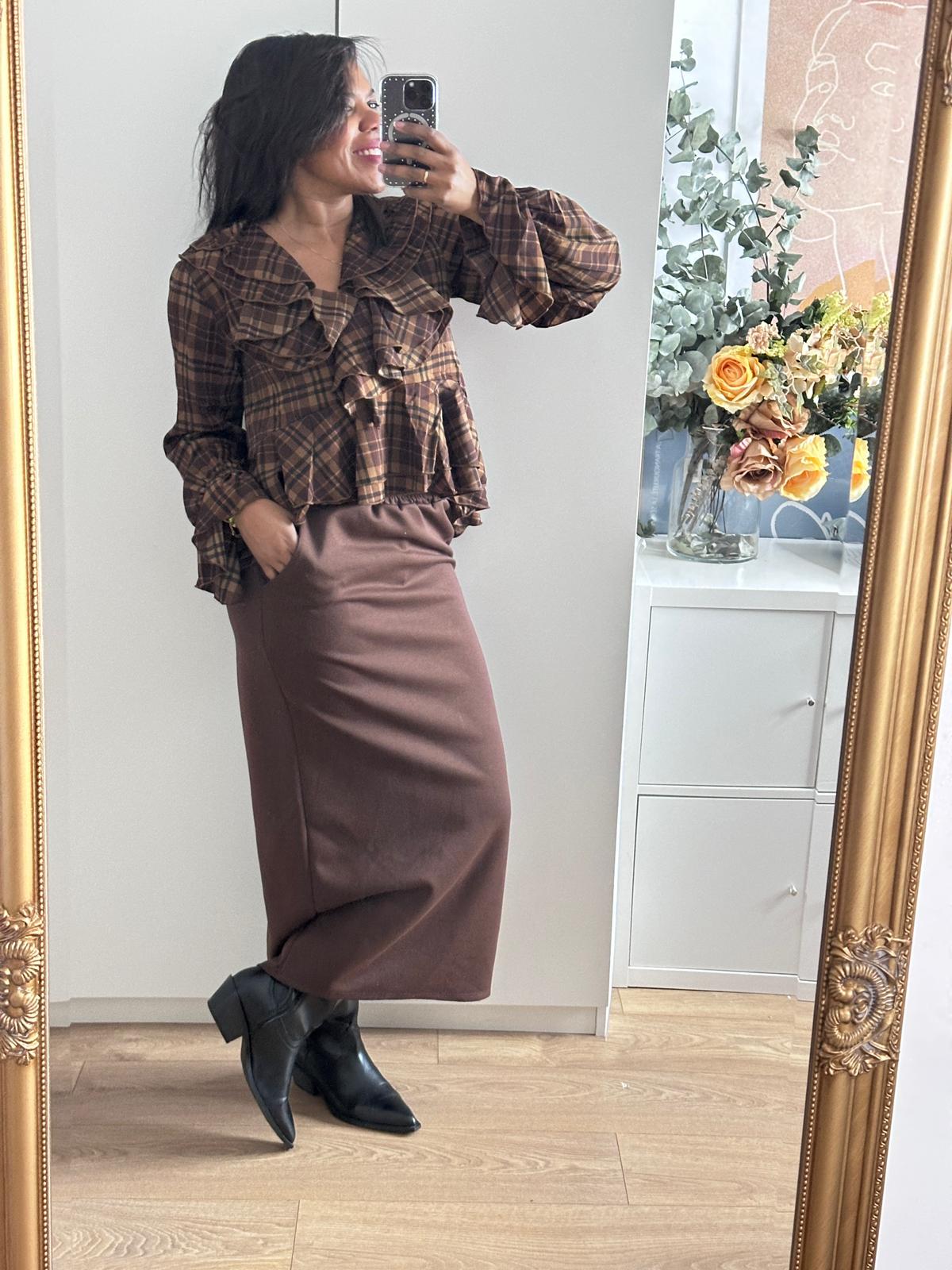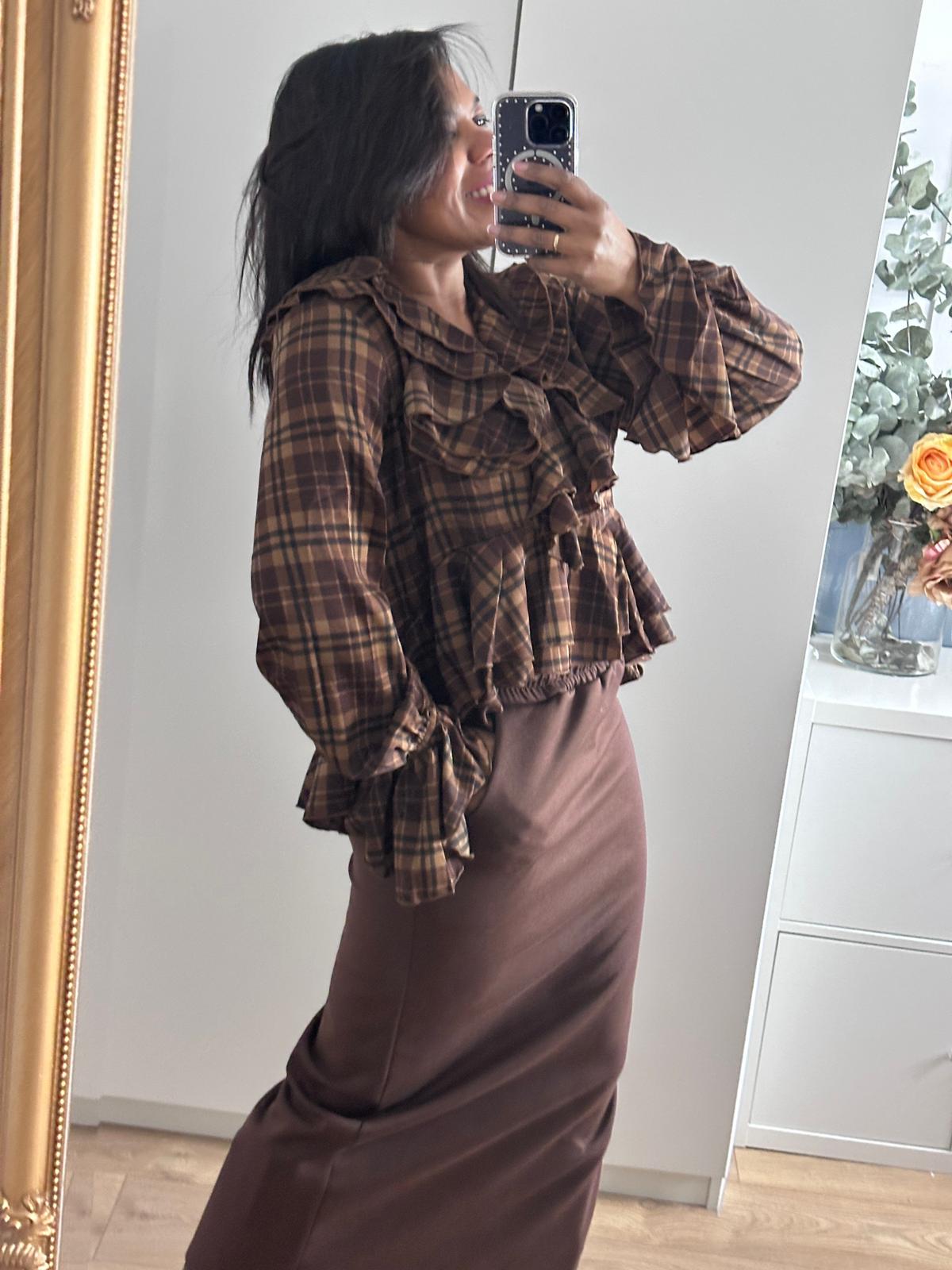 Blusa marrón de cuadros con detalles del cuello en pico con volante, corte más largo de los lados a atrás,