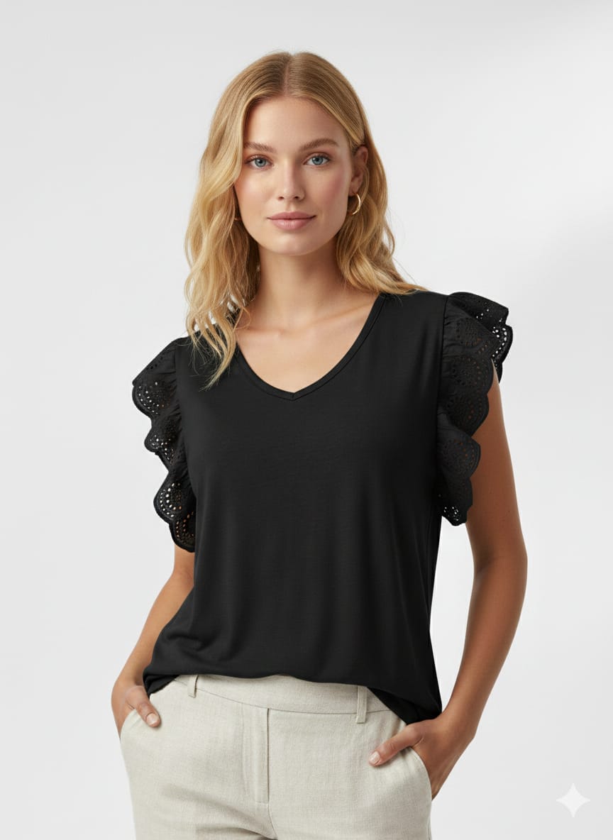 Camiseta negra amplia con decoración en manga, esta camiseta está compuesta por 95% de viscosa y 5% de elastano.