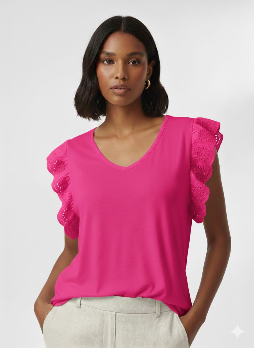 Camiseta rosa amplia con decoración en manga, esta camiseta está compuesta por 95% de viscosa y 5% de elastano.