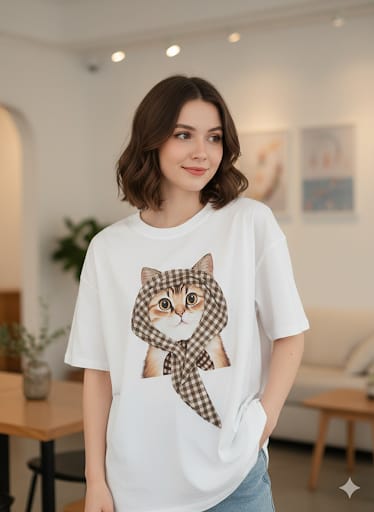 Camiseta blanca de talla única con dibujo de cara de gato en la que sobresale lazo vichy marron y beige.