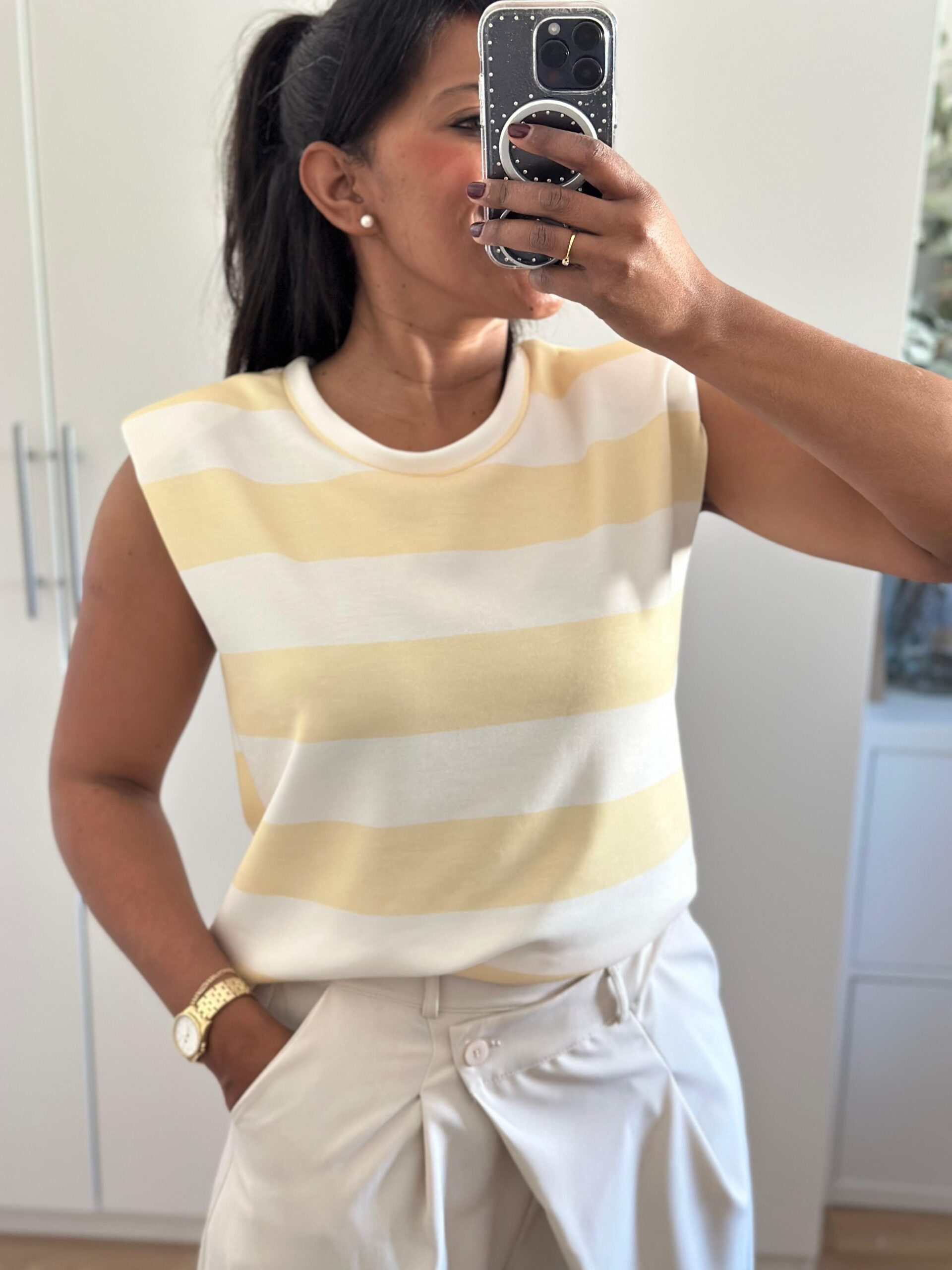 Camiseta con hombreras y  sin mangas. Comodísima y muy estilosa.