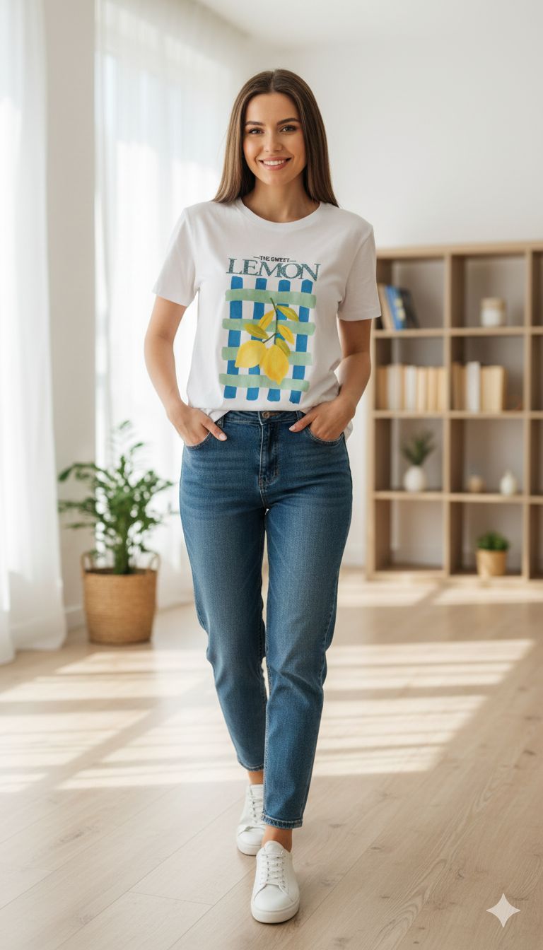 Camiseta blanca con dibujo de dos limones y un toque de brillo en la palabra lemon.