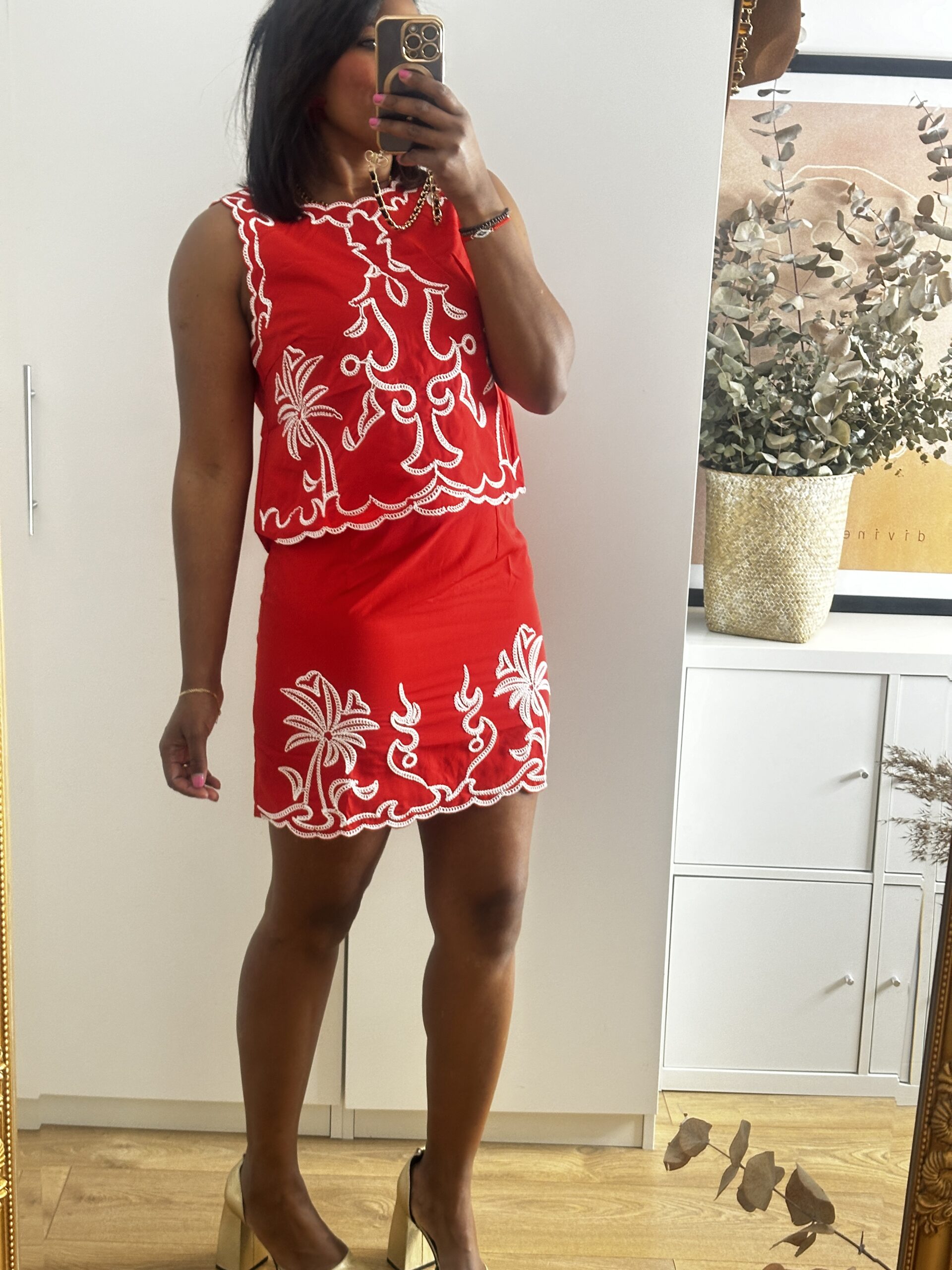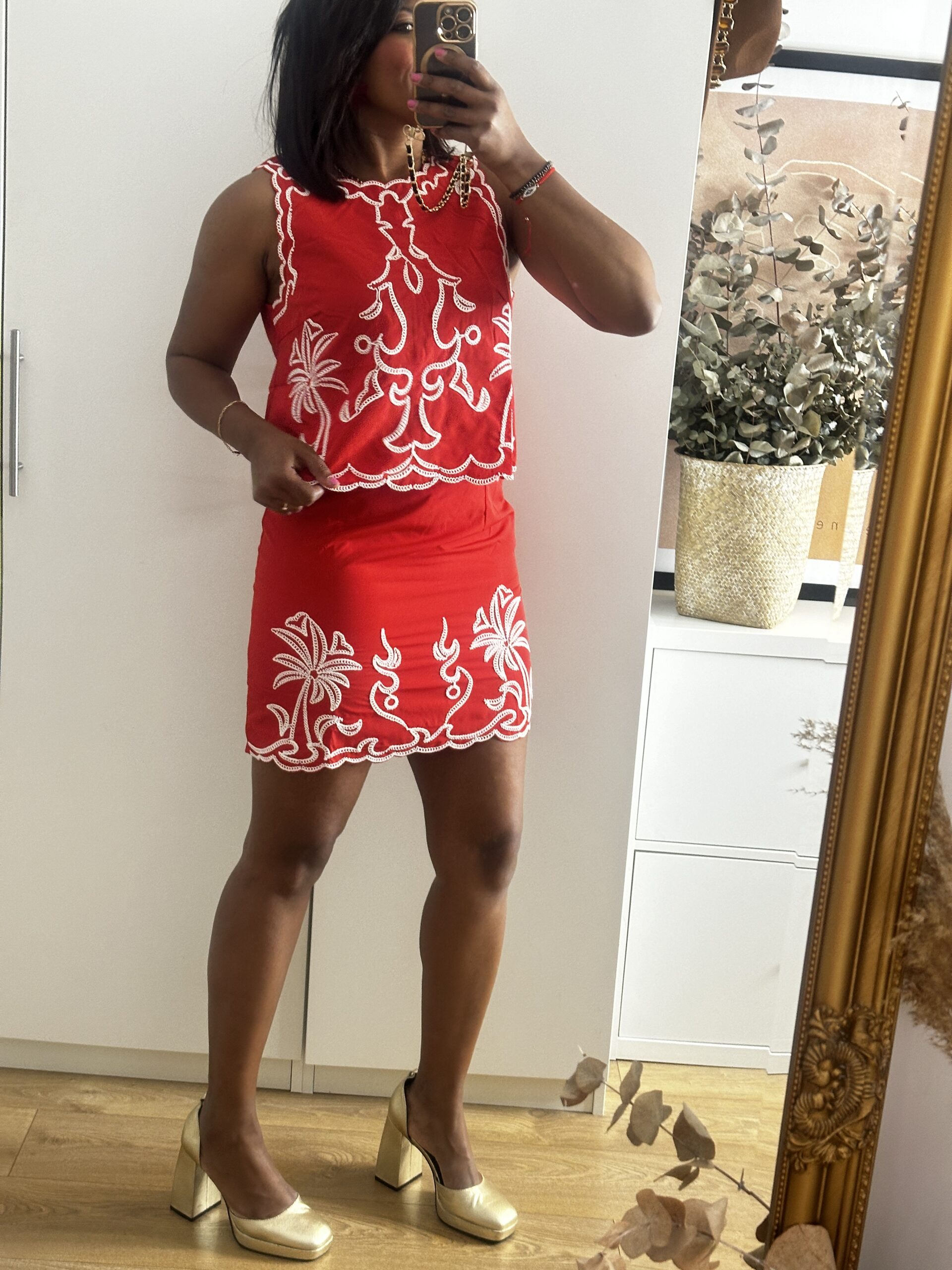 Conjunto falda y Top con detalles bordados , falda con cremallera invisible, tallaje normar , llevo una L y normalmente llevo una 38/40 .