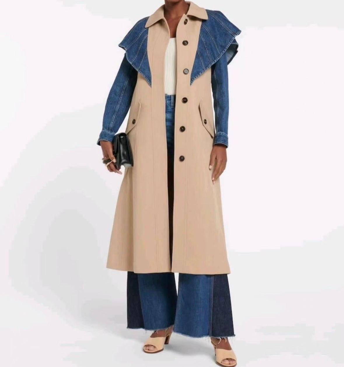 Gabardina beige con mangas y solapas en los hombros con tela vaquera azul.