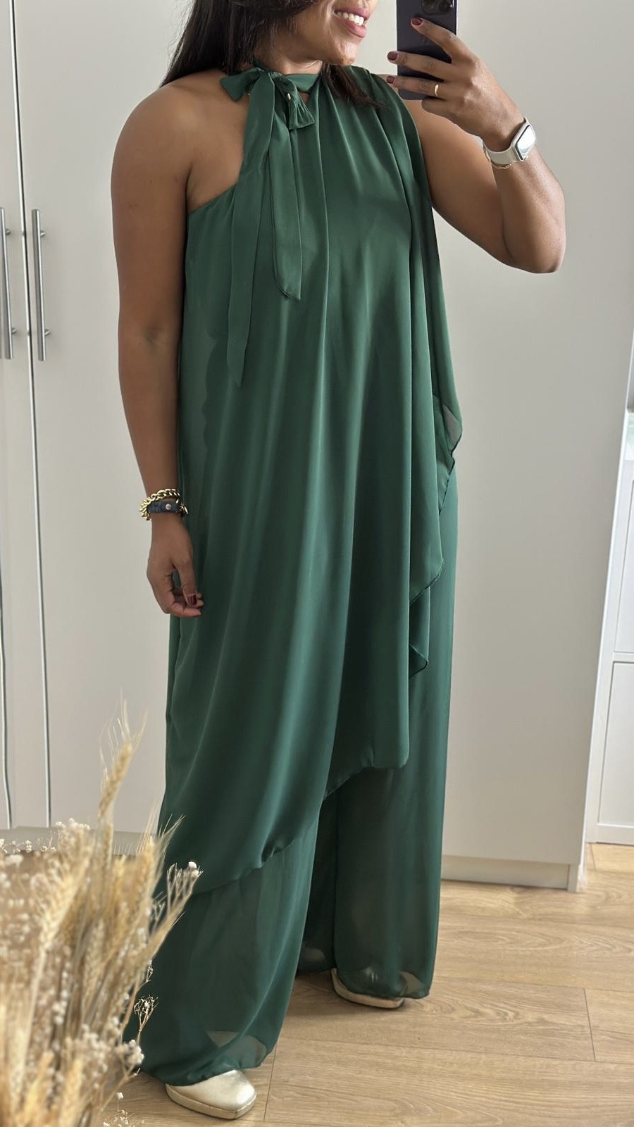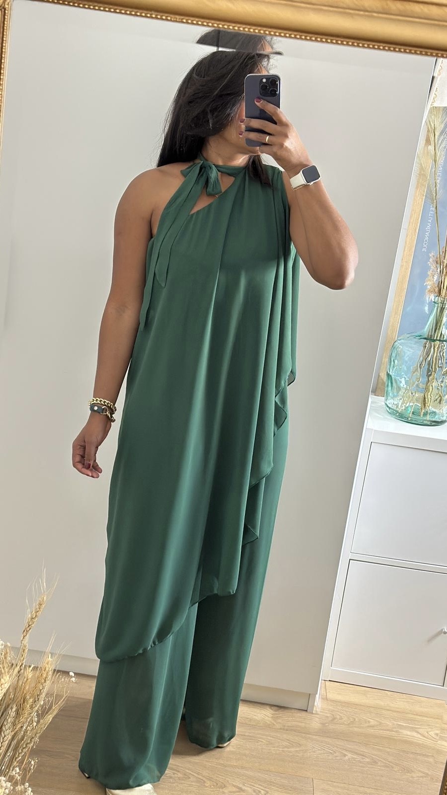 Mono verde talla única, con efecto capa elegante, fluido, talla única, un solo hombro y detalle en el cuello.