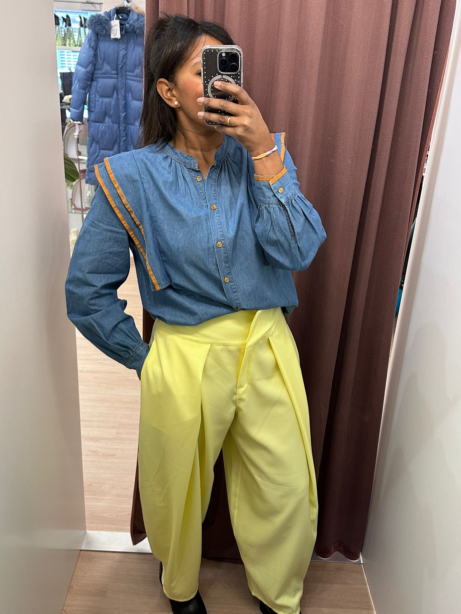 Pantalón amarillo abombado por arriba y cierre de pantalón con dos botones y cremallera,