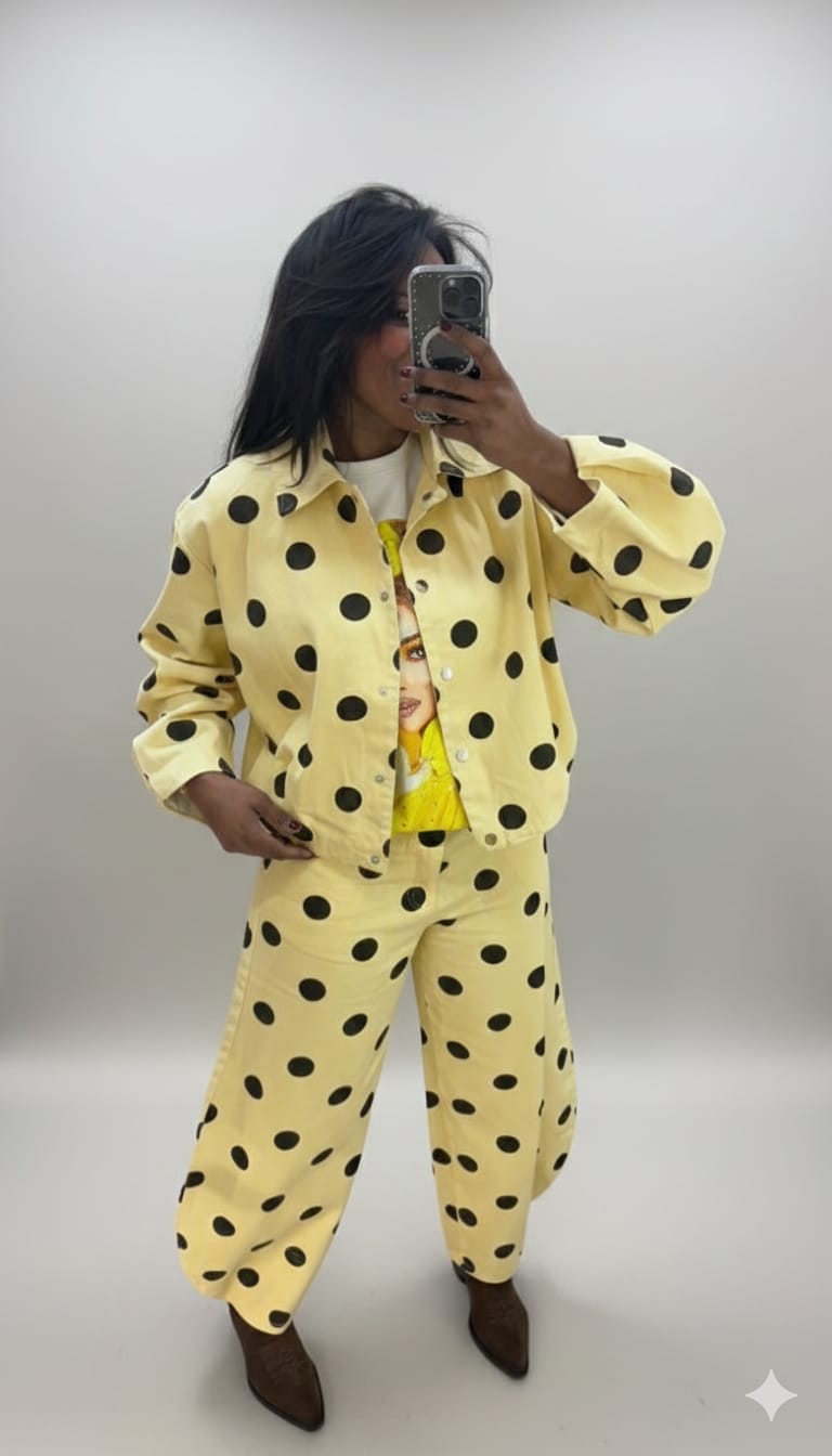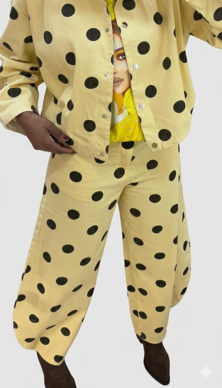 Pantalón vaquero amarillo con lunares negros, tipo globe.