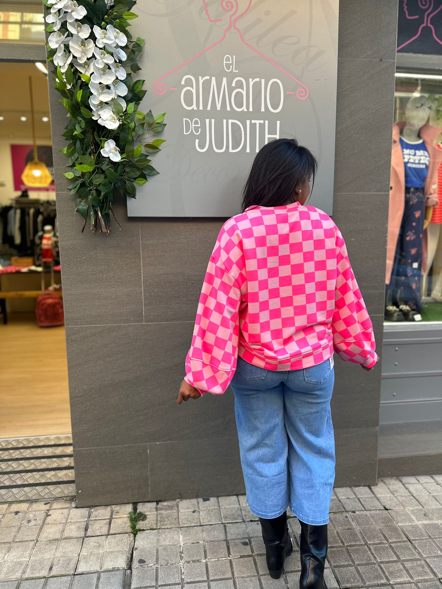 Sudadera de cuadros rosa palo y rosa fluor.
