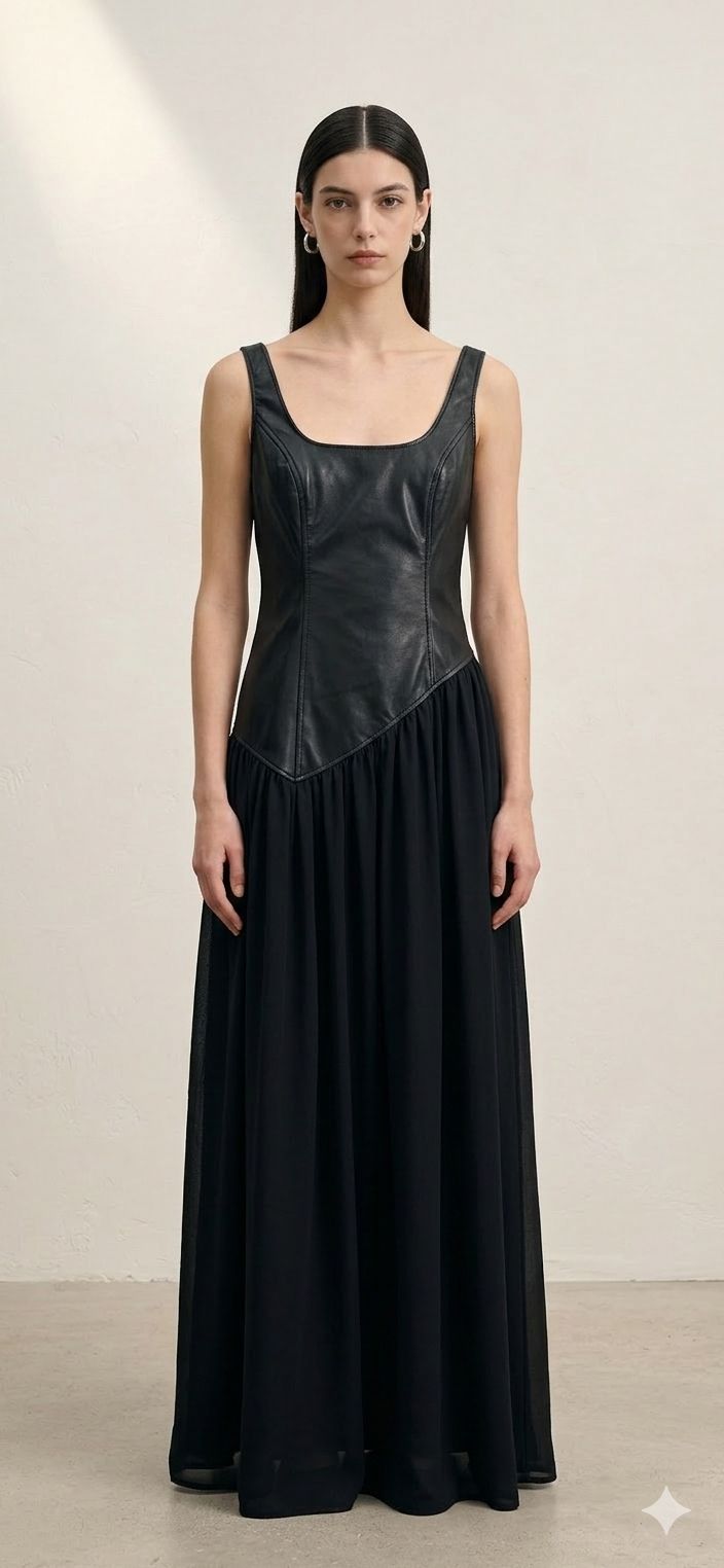 Vestido sin mangas, con cuerpo de polipiel y falda de gasa.