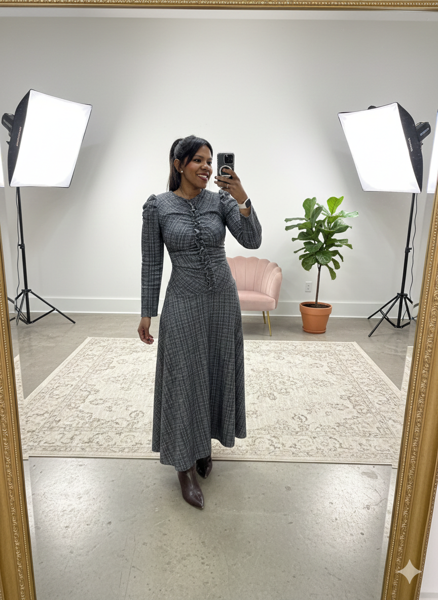 Mangas abullonadas con cuello redondo. Por detrás es liso con botones en cuello , tiene corte en cadera para marcar silueta .
