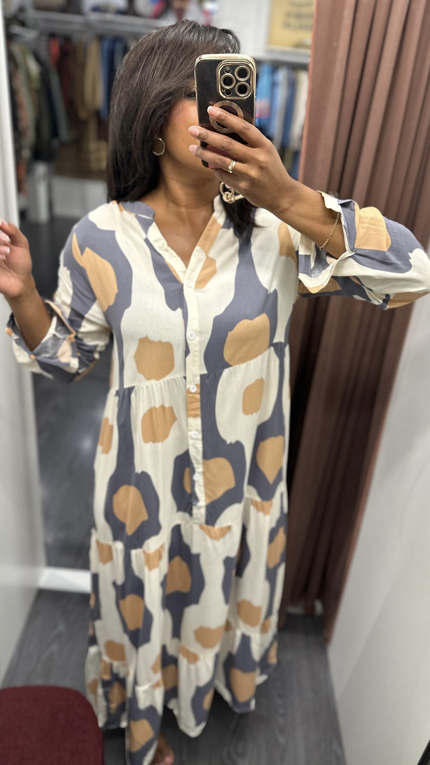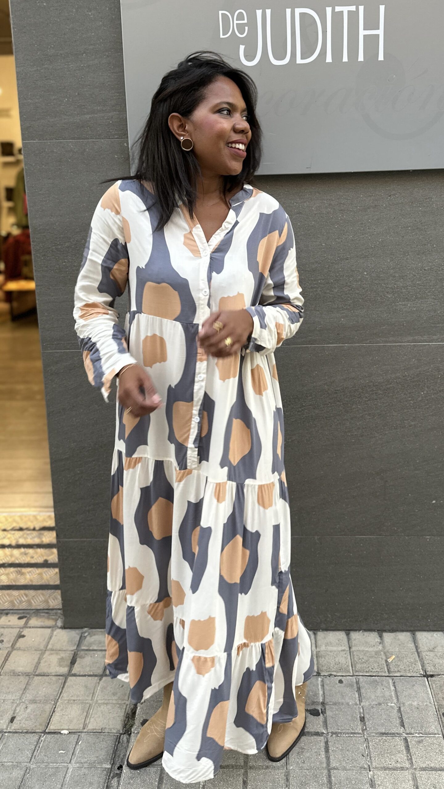 Vestido camisero largo, fluido y con volantes, mangas largas, disponible en varias tallas y con diseño que combina varios colores.