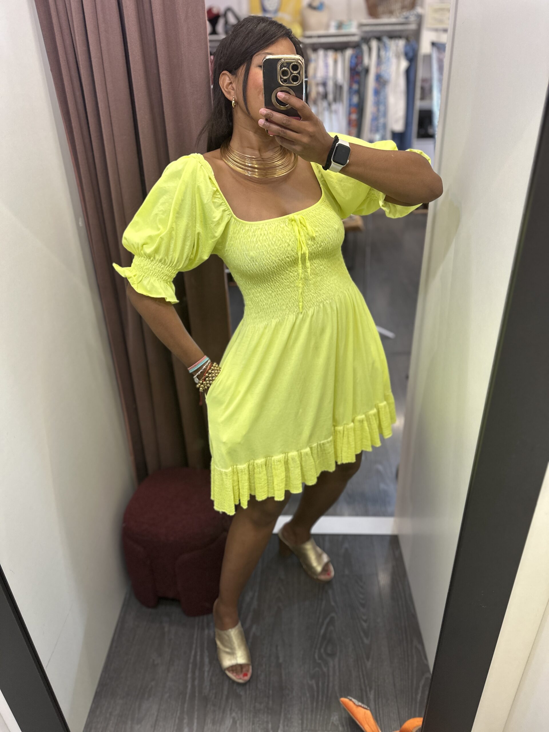 Vestido fluor con nido de abeja , talla única , mangas abullonadas y bolsillos laterales.