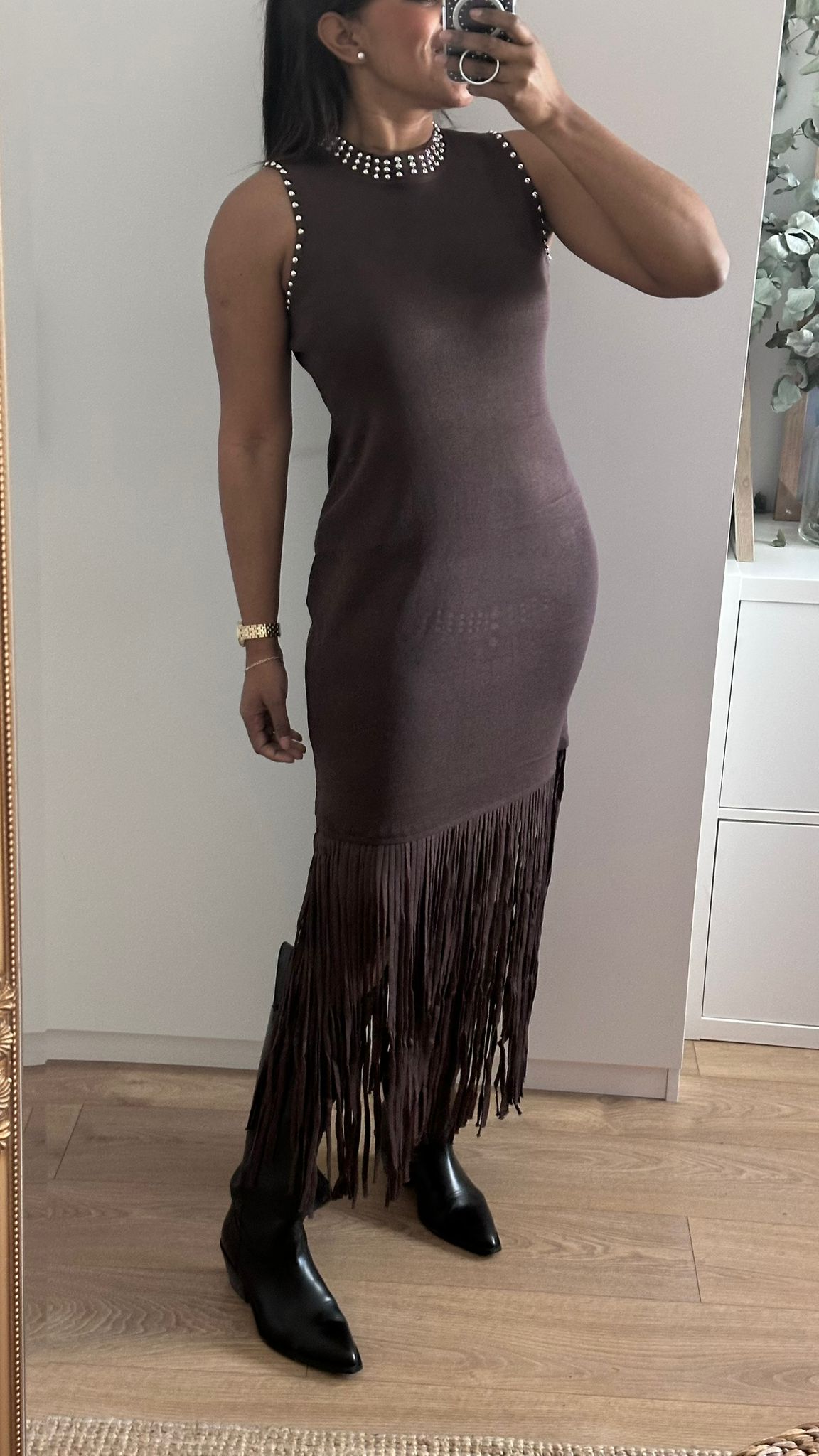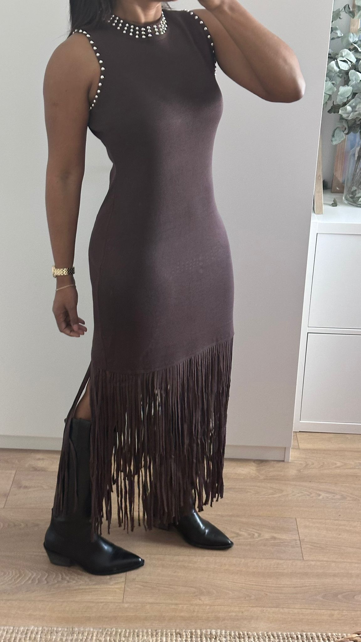 Vestido de canalé hasta la rodilla acabado con flecos, sin mangas marrón con cuello y borde de las mangas con tachuelas.