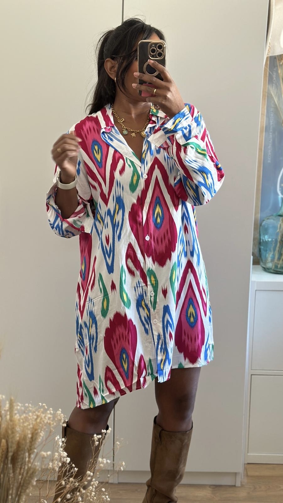 Vestido camisero corto blanco con estampado de colores vivos, mangas largas, botones centrales, disponible en varias tallas.