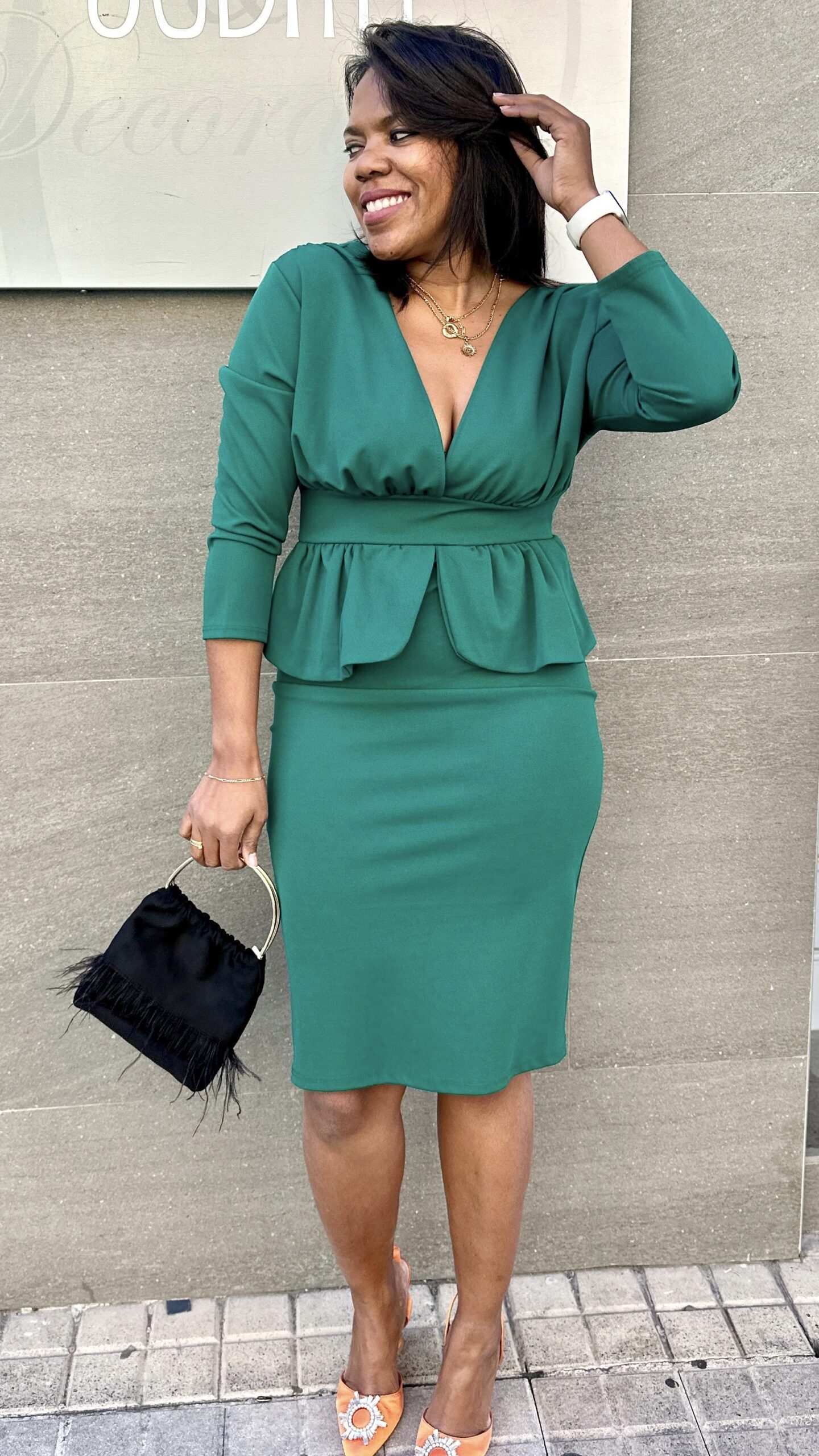 Vestido de fiesta con cuello en pico. Mangas largas, cinturón para marcar la figura. Talla única.